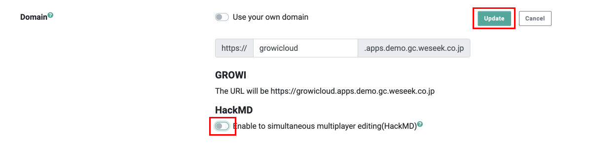 Click the "Enable to simultaneous multiplayer editing(HackMD)" toggle in the "Domain" section and turn it ON.